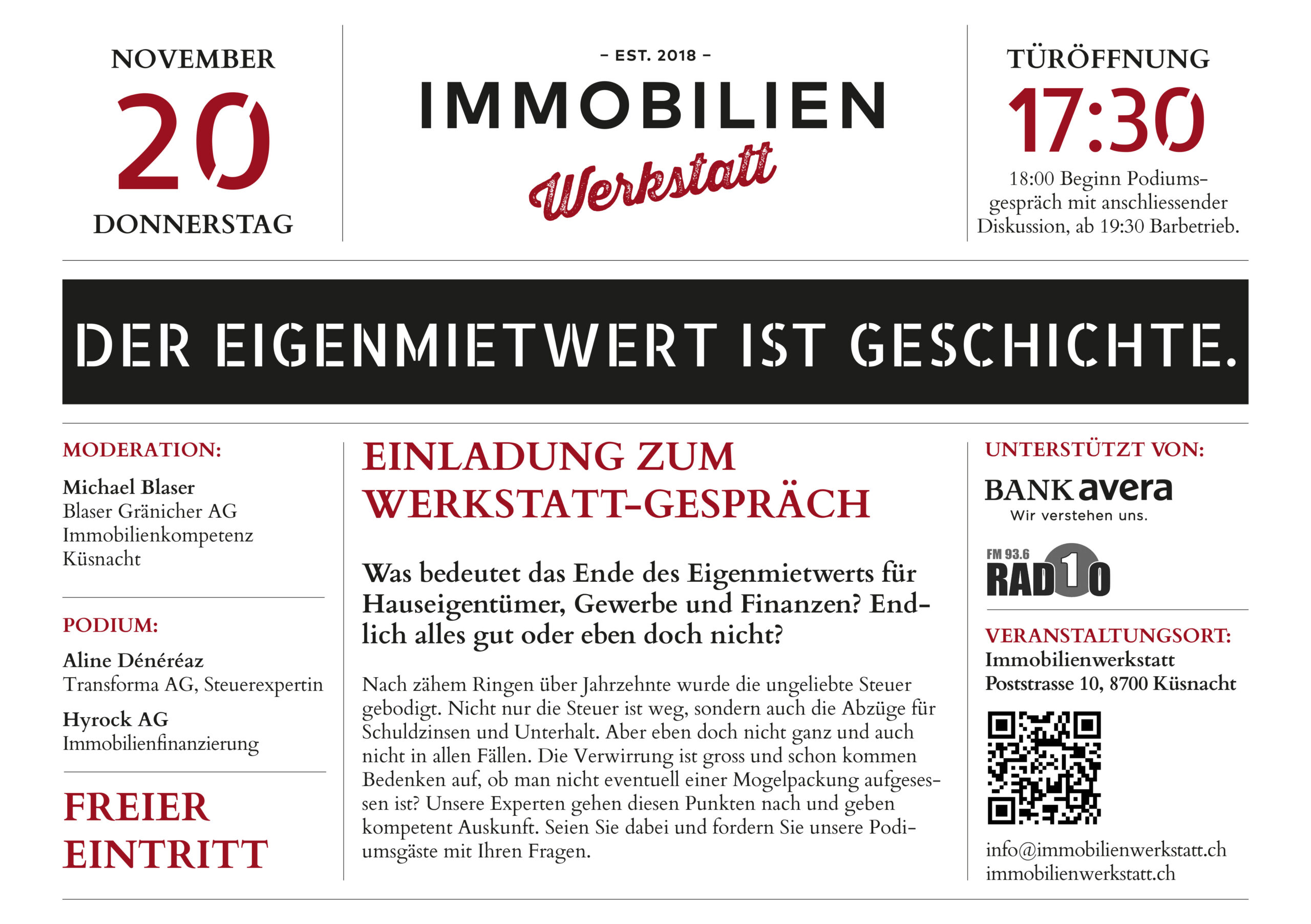 Der Eigenmietwert ist Geschichte – was bedeutet das nun für Hauseigentümer? Was sind die Folgen, steuerlich aber auch für die ganze Baubranche? Ist die neue Regelung ausgewogen oder handelt es sich gar um eine Mogelpackung? Unsere Experten aus den Bereichen Steuern, Finanzierung und Immobilien diskutieren auf dem Podium und mit den Gästen. Gewohnt bodennah, umgänglich und fachlich auf der Höhe der Zeit.